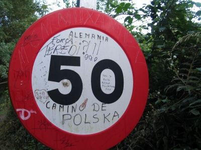 Wir hatten Glück, die Wanderung kann weitergehen. Nach einigen Metern kommen wir an einem Verkehrschild vorüber, das wie die meisten an diesem Weg mit Parolen u.a. beschmiert ist. Bisher habe ich diesen Graffities keine Beachtung geschenkt, doch bei diesem Schild schaue ich zufällig (?) zum ersten Mal genau hin und lese: