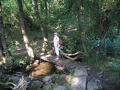 Die heutige Wanderung ist wieder landschaftlich sehr schön. Wir pilgern durch eine ländlich beschauliche Gegend, das Wetter ist schön, die Füße sind okay – Pilgerherz, was willst du mehr? Doch, eins stört uns sehr. Fast alle Kirchen sind nach wie vor geschlossen. Wir hätten so gerne hin und wieder mal eins dieser Kirchlein betreten, die so viel strenge Würde ausstrahlen und stille Einkehr versprechen. Viele kleine Bachläufe werden überquert oder begleiten unseren Weg, plätschern leise und blitzen in der Sonne. Vögel zwitschern im Wald, Hähne krähen in den malerischen Dörfchen - und die Spanier, die zuhauf unterwegs sind, quatschen wie die Weltmeister. Mir fällt ein, dass Hape Kerkeling auf seiner Pilgerwanderung so viele Schmetterlinge gesehen hat – wo sind die geblieben? Wir sehen nur gelegentlich welche.