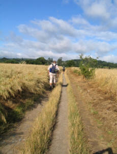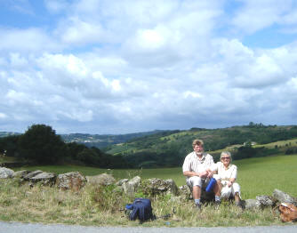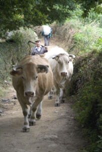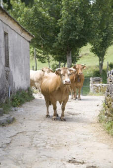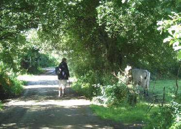 Das Wetter ist optimal. Es ist nicht zu warm, und hin und wieder schieben sich Wolken vor die Sonne, bevor sie uns den Schweiß auf die Stirne treiben kann. Wiesen, Weiden, Felder mit kleinen Steinmauern als Umgrenzung, Baumgruppen, Bäche und kleine Weiler begleiten unseren Weg. Und hin und wieder begegnen uns nicht nur Pilger, sondern auch "richtige" Menschen - Menschen, die arbeiten oder nur vor ihrem Haus zufrieden in der Sonne sitzen und das Leben genießen - warum krieg ich das eigentlich nie hin? - und alle möglichen Viecher von hier laufen uns natürlich auch über den Pilgerweg.