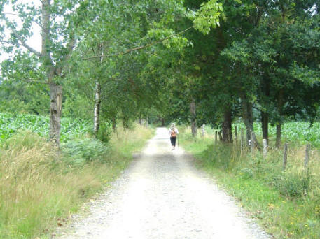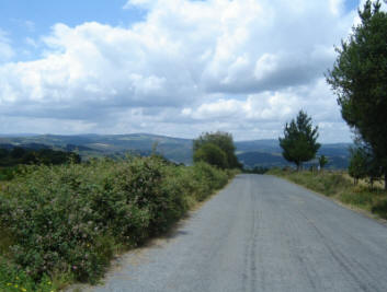 Anfangs wandert man auf dem Camino zwischen Pedrouzo und Santiago noch gemütlich hügelauf, hügelab durch ländliche Idyllen, bis man an den Rand der großen Stadt Santiago kommt. Hier geht es auf einem asphaltierten Sträßchen weiter.