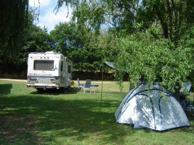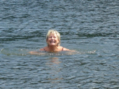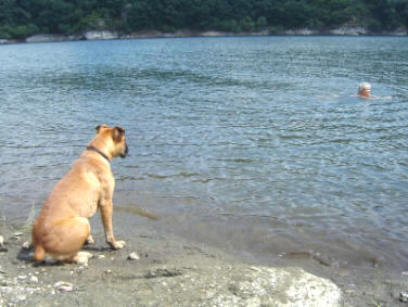 Am Nachmittag ziehen wir in Badeklamotten und mit Handtüchern bewaffnet hinunter zum Stausee, dessen Ufer etwa 30 Meter vom Campingplatz entfernt ist. Die "Wachhunde" des Platzes, ein gutmütiges Boxerpärchen, begleiten uns und passen auf uns auf. Günther mag nun doch nicht ins Wasser gehen, weil der Untergrund etwas glitschig ist und er keine Badeschuhe dabei hat, aber ich genieße das Bad im warmen Seewasser auch ohne ihn.