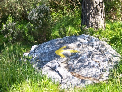 links: Camino-Kilometerstein - noch 96 km bis zum Grab des Heiligen Jakobus...