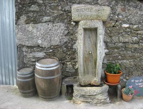 Der kleinen Igrexa de Sta María de Mirallos, die am Camino liegt, hätten wir gerne einen Besuch abgestattet, aber sie ist geschlossen - kein Stempel. Schade. So begnügen wir uns mit einem Besuch des kleinen Kirchhofs und ruhen uns kurz auf dem Brunnen oder Weihwasserbecken in seiner Mitte aus.