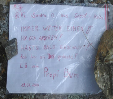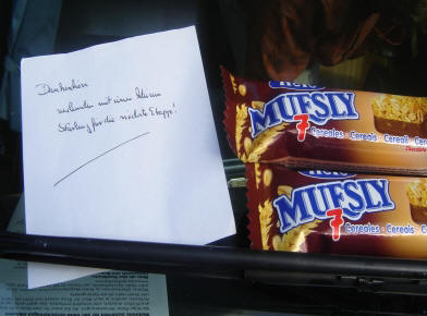 · 7.20 Uhr: Auf jeht’s! – Beim Öffnen der Vorhänge im Cockpit entdecken wir zwei Müsli-Riegel und ein Briefchen von unserem Pilgerfreund aus Mainz und sind gerührt.
