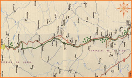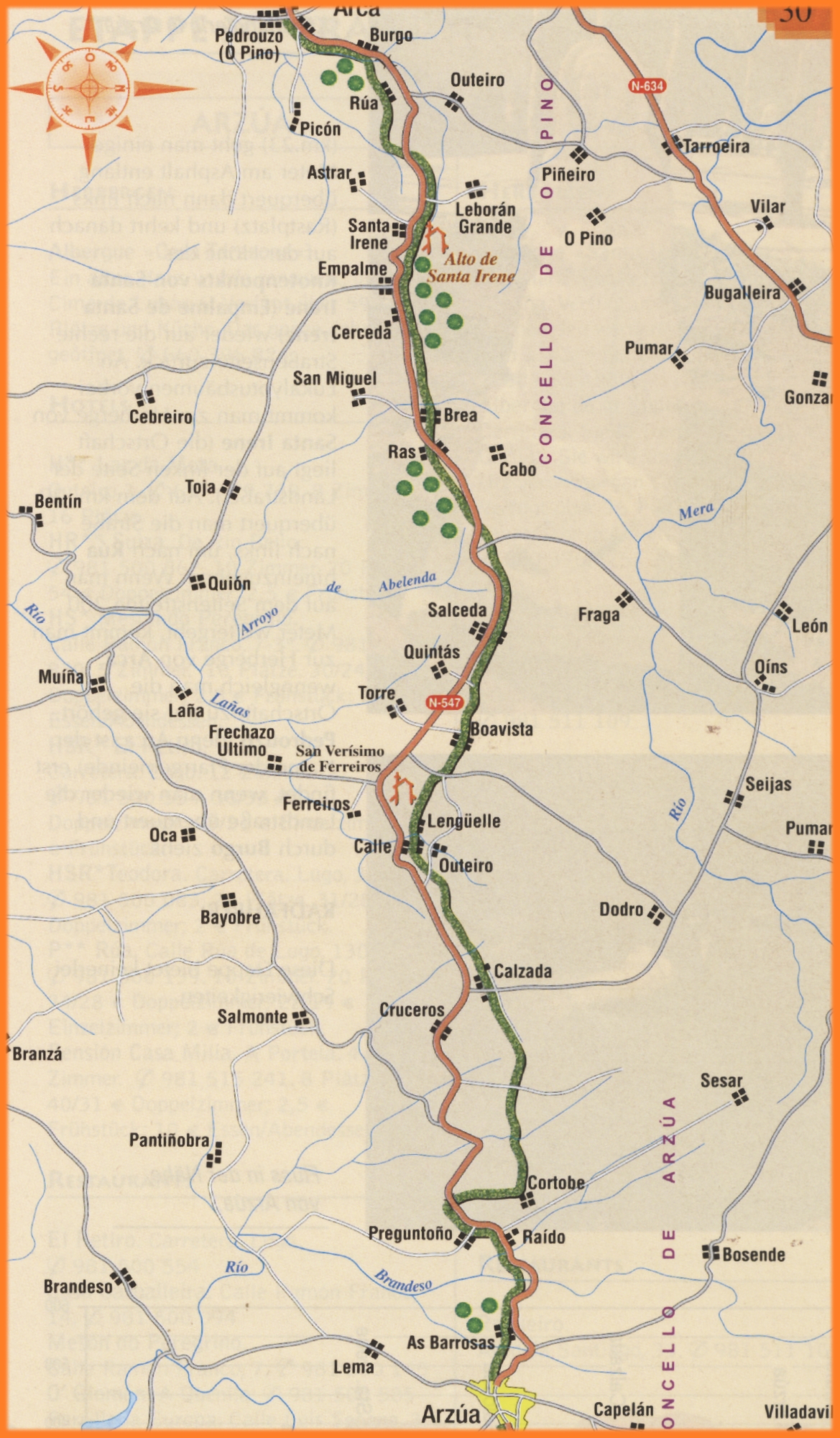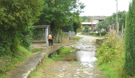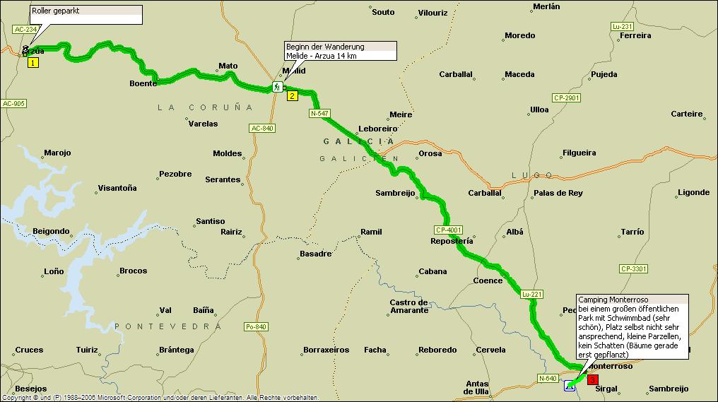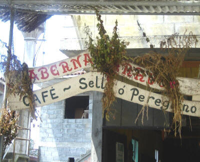 Als wir Pedrouzo (Gemeinde Arca) erreichen, beginnt es zu regnen (hoffentlich haben die beiden inzwischen ein Dach über dem Kopf!). Obendrein stellen wir fest, dass wir unseren Roller ziemlich ungünstig geparkt haben, denn wir müssen durch das ganze Nest hindurch latschen, was nicht sehr erbaulich ist, denn Pedrouzo ist ein trübseliger Ort – finde ich jedenfalls. Er wird auch weiter nicht in den Reiseführern erwähnt.