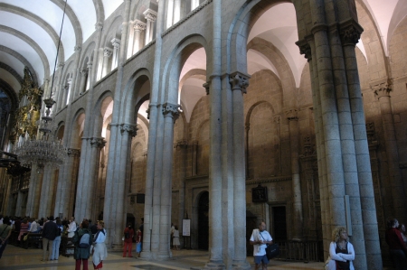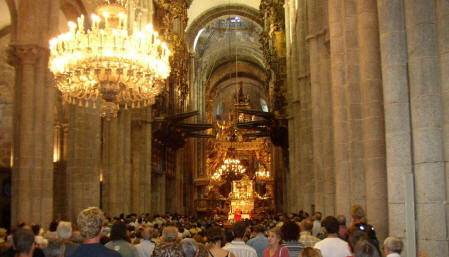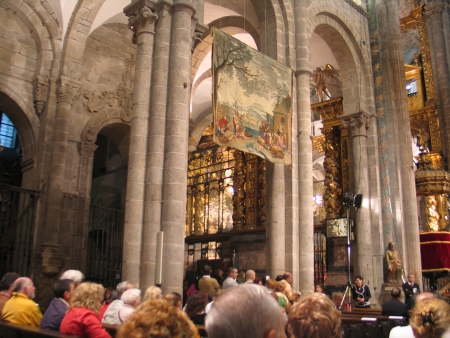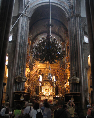 Und dann wenden wir uns der Kathedrale zu, die das Endziel unserer Pilgerreise ist. Da heute Abend das große Feuerwerk stattfinden wird, ist die große Freitreppe bereits wegen einiger Aufbauten gesperrt, so dass wir durch einen Seiteneingang die Kirche betreten. Ich bin verwundert, wie dunkel sie wirkt, weil ich sie mir Licht durchflutet vorgestellt hatte. Aber gerade wegen der dunklen Atmosphäre wirkt der über und über mit Gold geschmückte Altar als einziger Lichtpunkt in der Kathedrale besonders dramatisch. Zugegeben: Ich finde ihn etwas kitschig mit den riesigen goldenen Engeln, die ihn rechts und links flankieren. Auch die Figur des Heiligen Jakobs scheint mir nicht unbedingt ein bemerkenswertes Kunstwerk zu sein. Aber das ist nur meine bescheidene Meinung. Irgendwie sind wir enttäuscht von dieser weltberühmten Kirche, auf die wir uns so gefreut hatten, und haben nun erst mal keine große Lust, sie noch weiter zu besichtigen. Das machen wir morgen nach der Messe. Auch dem Apostel Jakobus, so er dort überhaupt dort in Form seiner Gebeine vertreten ist, werden wir dann unsere Aufwartung machen.