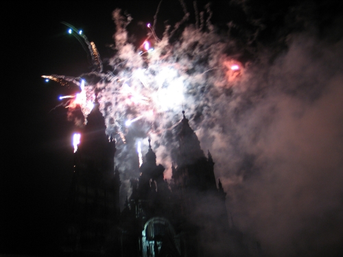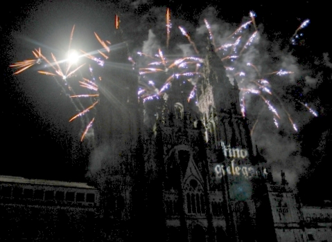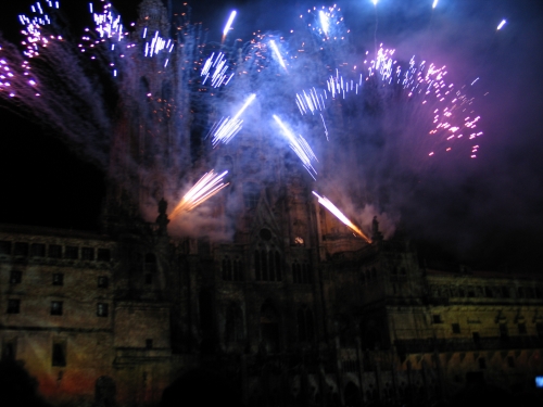 Das Feuerwerk übertrifft die kühnsten Erwartungen, es ist unglaublich schön. Lichteffekte auf der Kathedrale (die Jakobsmuschel, ein Blätterwald, Fassaden anderer Kathedralen dieser Welt – z.B. von der in Siena, Schriftzüge, die über die Fassade wandern, oder die Fassade der Kathedrale selbst in einer Art Skizze), Feuerwerk und Musik harmonieren so gekonnt, es ist ein atemberaubendes Meisterwerk.