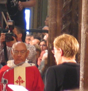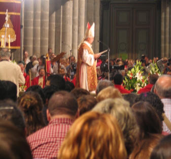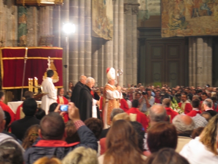 Die Festmesse beginnt mit dumpfen Schlägen und viel zu leisem Chorgesang. Die Lautsprecheranlage scheint defekt zu sein. Ich mach’s kurz – die Messe ist im ganzen enttäuschend, ohne Leidenschaft - könnte ein evangelischer Gottesdienst sein. Ein Funke springt bei uns jedenfalls nicht über. Schade. Lange Ansprache der spanischen Parlamentspräsidentin, die als Vertreterin des Königs da ist, ebenso lange Predigt des Erzbischofs, der seine Ansprache ohne jegliche Modulation seiner Stimme vom Blatt abliest… Meine Nachbarin flüstert mir ins Ohr: