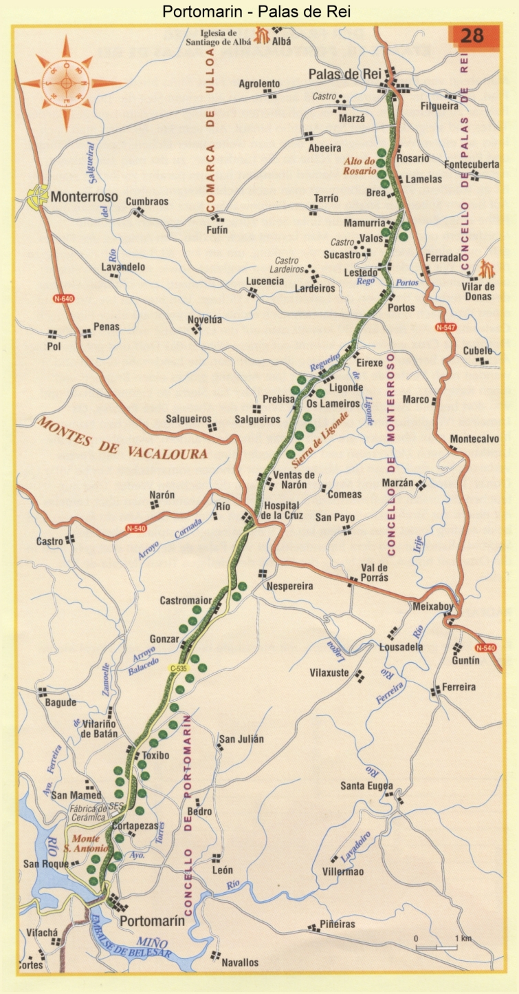 San Marcos ist ein altes Dorf, in dem man zum Besuch Papst Johannes Pauls II. im Jahre 1989 einen riesigen Pilgerkomplex baute, an dem wir wenig später vorüber wandern. Hier liegt auch ein weiterer Campingplatz: Camping Monte do Gozo, von dem man aber von der Straße aus wenig sieht.
