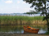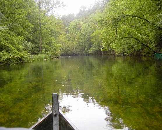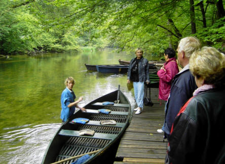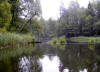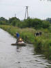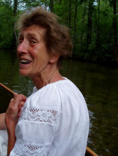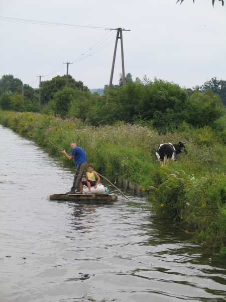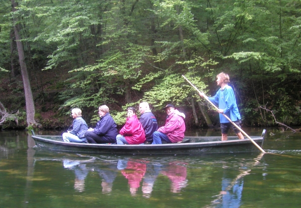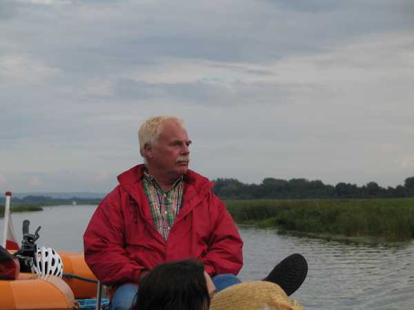 Sie tritt sogleich aus der Haustür, als wir mit unseren knatternden Gefährten vor dem Haus Nr. 8 anhalten. Auf den ersten Blick weiß man, dass diese Frau ein wirkliches Original ist. Herzlich werden wir begrüßt und durch ihren Garten zum Fluss geführt. Dort liegen einige der flachen Boote bereit. Da wir nicht alle in einen Kahn passen, hat Cristina einen zweiten Bootsfahrer, Uli, angeheuert, der aber kein Deutsch spricht. Egal, das Sprechen übernimmt Cristina sowieso mit einer großen Lebendigkeit und einem anziehenden Humor. Übrigens: Ihr Sohn, der in Deutschland lebt, hat eine schöne Homepage erstellt mit Infos über die Krutynia, seine Schwiegermutter und die kleine Pension, die die Familie betreibt.