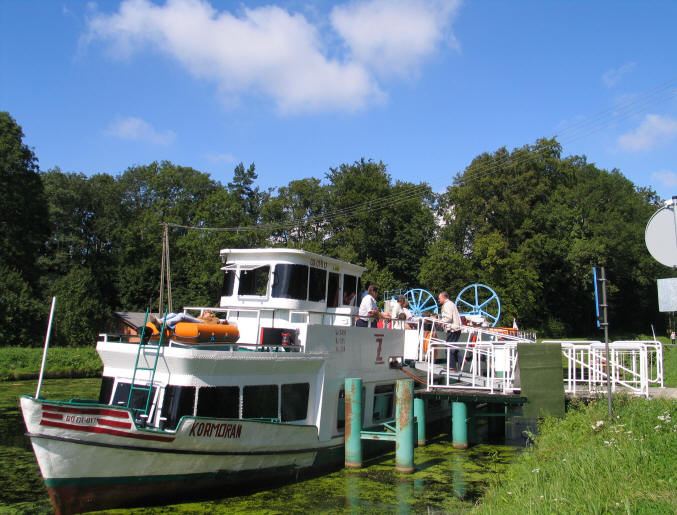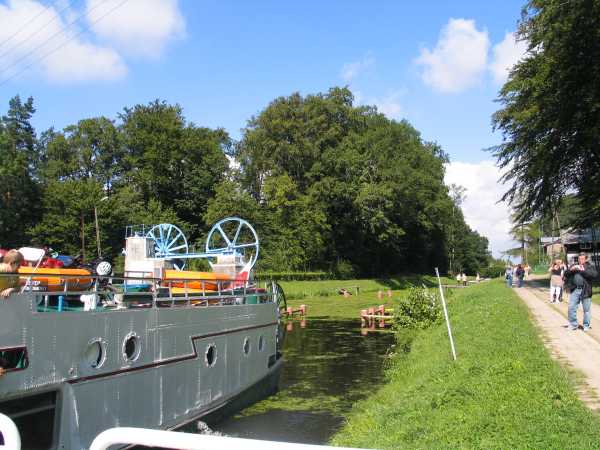 Am späten Vormittag werden wir von einem Kleinbus abgeholt, der uns nach Buczyniec (Buchwalde) bringt, wo wir unser gebuchtes Schiff, die „Kormoran“ besteigen. In freudiger Erwartung der kommenden Erlebnisse nehmen wir auf dem offenen Oberdeck Platz. Vor uns liegen ca. 5 Stunden auf dem Elblag-Kanal und 5 „schiefen Ebenen“, über die unser Schiff gezogen wird.