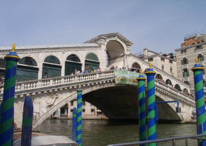 Auf dem Weg zur Rialto Brücke genießen wir das Flair der schmalen Gässchen an kleinen Kanälen mit hübschen Brücken, der wunderschönen alten Häuser und Palazzi, der bunten Kitsch-, Kunst- und Modeläden rechts und links unseres Weges.