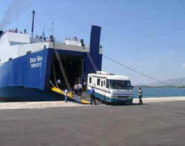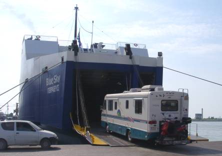 Gegen 10 geht das Rangieren der PKWs, LKWs und Wohnmobile los, doch es wird fast 13 Uhr, bis unsere Autos endlich im Bauch unseres riesigen Fährschiffes „Blue Sky“ verschwinden. Leider haben wir keinen der begehrten Plätze an einem der Fenster des Camperdecks bekommen, weil wir bereits in Igoumenitsa das Schiff verlassen, während viele der anderen Wohnmobilisten noch bis Patras weiterfahren.