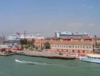 Mit geringer Verspätung verlassen wir den Hafen von Venedig und fahren durch den Canale della Giudecca und den Canale di San Marco aufs offene Meer hinaus. Beim Zurückschauen auf den Hafen staunen wir erneut über die riesigen Pötte, die dort vor Anker liegen: Sie überragen die Häuser von Venedig.