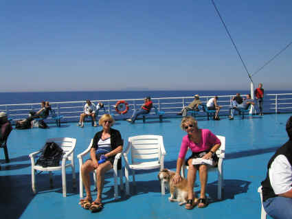 Das Wetter ist herrlich, und wir suchen uns ein windstilles Plätzchen auf dem Oberdeck, um die ersten Stunden der Überfahrt nach Griechenland in der Sonne zu genießen.