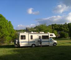 Nach einigen auf- und anregenden Minuten auf der Alb- / Traumstrecke (einerseits/andererseits) entdecken wir erleichtert auf der linken Seite des Weges das angekündigte Brunnenhaus und ihm gegenüber eine ziemlich ebene Wiese, auf die man sogar mit unseren großen Womos problemlos fahren kann. Zwei deutsche Wohnmobile stehen bereits dort, und wir gesellen uns zu ihnen. Platz ist genug  auf der grünen Wiese.