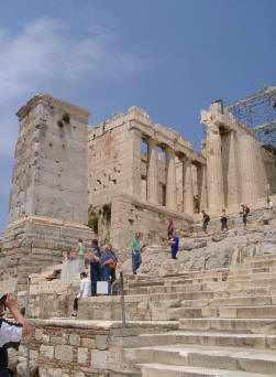 In den Jahren 437 bis 431 v. Chr. erhielt die Akropolis mit den Propyläen eine eindrucksvolle und repräsentative Eingangsanlage. Flankiert von niedrigeren, dem Gelände entsprechend asymmetrisch angelegten Flügelbauten, öffnet sich dem Besucher, wenn er die letzten Stufen zur Akropolis erklommen hat, eine monumentale Tempelfront mit sechs Säulen und einem Giebeldach über dieser Fronthalle.