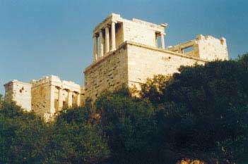 Südlich der Propyläen erblickt man den Tempel der Athena Nike (Nike-Tempel), der um 420 vor Christus erbaut wurde und an die griechischen Siege über die Perser erinnern sollte. In seinem Inneren stand das Kultbild der Siegesgöttin Athene, der Göttin des Krieges und der Weisheit, die als Stadtbehüten Athens verehrt wurde. Der kleine Tempel wurde von den Türken 1687 abgetragen, dann 1835 und nochmals 1941 restauriert.