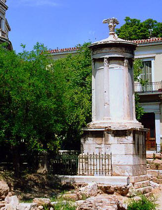 Beinahe übersehen hätten wir dann das Lysikrates Denkmal, das am Anfang der Tripodon Strasse steht. Es wird von den heutigen Athenern auch "Laterne des Diogenes" genannt, ist aber in Wirklichkeit nur der Sockel für den Preis aus einem Theaterwettbewerb, den der Chorleiter Lysikrates 334 v. Chr. gewonnen hatte.