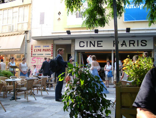 Gegenüber dem Cine Paris, einem der bei den Athenern beliebten Sommerkinos, entdecken wir schließlich einige ansprechende Straßenlokale  und lassen uns nach eingehendem Kartenstudium erleichtert auf den gemütlichen Korbsesseln nieder.