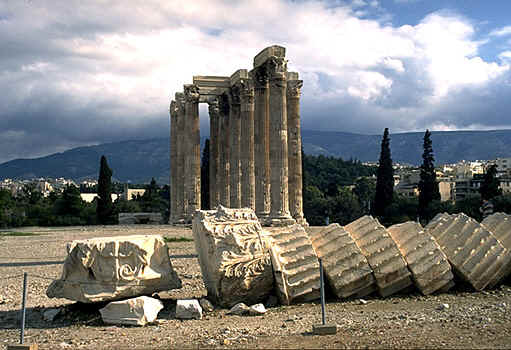 Unweit des Hadriansbogens entdecken wir die Säulenrelikte des Tempels des olympischen Zeus (unten), der in seinen Ausmaßen selbst den Parthenon übertraf und der größte Griechenlands war.