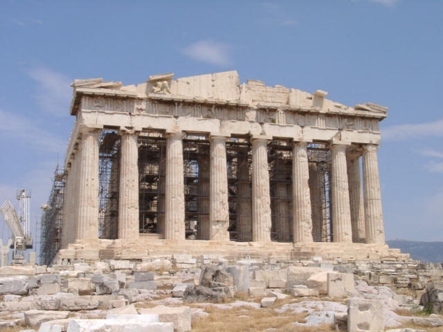 Auch ohne den vollständigen Figurenschmuck beeindruckt dieser Bau durch seine vollendete Harmonie und die geschlossene Wirkung. Alle Maße zwischen den Bauteilen stehen im Verhältnis 4:9. Acht dorische Säulen an den Schmal- und 17 an den Längsseiten (statt wie bei früheren Tempeln sechs und 13) fügen sich zur Ringhalle, welche die Cella, den früheren Standort der monumentalen Athene-Figur, umgibt. Die leichte Innenneigung und die Schwellung der Säulen, die etwas dickeren Ecksäulen, die Stufen, die eine sanfte Wölbung bilden, die geringe Aufwölbung des Gebälks - alle diese optischen Eingriffe sorgen dafür, dass das Gebäude trotz seiner Größe leicht wirkt und zu atmen scheint.