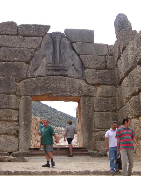 Das so genannte Löwentor ist das Haupttor in der äußeren Mauer der Burg von Mykene. Es stammt aus dem frühen 13. Jahr-hundert v. Chr. und ist nach dem etwa drei Meter hohen Kalksteinrelief in dem Entlastungsdreieck über dem Torsturz be-nannt. Das Relief zeigt zwei Löwen, die sich, mit den Vorderpfoten auf der Basis einer kretischen Säule stehend, entlang der Säule aufrichten. Die Köpfe der Löwen waren wohl aus einem anderen Material gefertigt und an-gesetzt; sie sind verloren.