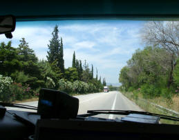 Eine wunderschöne Wegstrecke liegt nun vor uns; wir fahren am Golf von Korinth entlang. Immer wieder hat man herrliche Ausblicke auf das Meer, und entlang der Autobahn wird dem Auge eine schöne Bepflanzung mit Oleander geboten. Wo diese einmal fehlt, springt die natürliche Vegetation des Landes ein mit leuchtendgelb blühenden Ginsterbüschen.