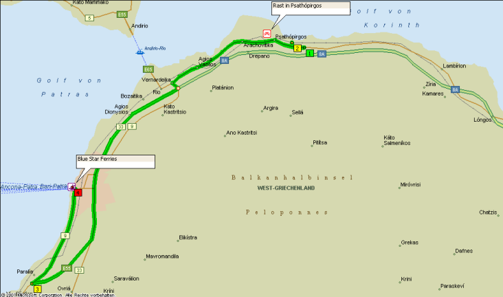 So kommen wir schon viel zu früh im Hafen von Patras an. Die Männer fragen beim Fährbüro nach, aber der Schalter von Blue Star Ferries ist noch nicht besetzt (angeblich erst ab 20 Uhr). Im Hafen ist es tierisch laut und heiß, kein Lüftchen geht, hier wollen wir eigentlich nicht unsere letzten Stunden auf griechischem Boden verbringen. Kurze Lagebesprechung. Wir fahren noch einmal die Küstenstraße entlang und suchen uns ein Plätzchen, wo wir die Wartezeit angenehmer gestalten können.