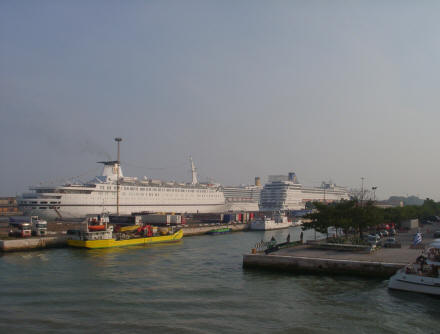 Wir stehen früh auf, denn gegen 8 soll die Fähre in Venedig sein. Noch während wir frühstücken, kommen die ersten Ausläufer Venedigs in Sicht. Und wieder passieren wir die herrlichen Bauten der Lagunenstadt und können uns nicht satt sehen an diesem wunderbaren Bild, das da an uns vorüberzieht.