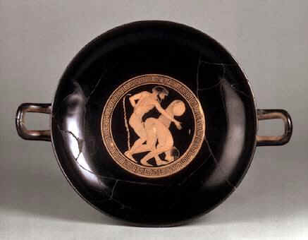 Ashmolean Museum, Oxford, UK/Bridgeman Art Library, London/New York Griechische Trinkschale Zweihenklige Keramikschalen (Kylix) waren im Griechenland der Antike die am weitesten verbreiteten Trinkgefäße. Dieser heute im Ashmolean Museum in Oxford ausgestellte Kylix ist mit einem erotischen Motiv verziert. Die Archaik, in deren Verlauf sich die griechische Kultur durch weit reichende Handelsbeziehungen im Mittelmeerraum und Vorderen Orient weiter ausbreitete, spiegelt in ihrer Bezeichnung (abgeleitet von dem griechischen Wort arché: Beginn, Anfang) ihre Einordnung als eine Art Vorstufe zur Klassik. Sie ist gekennzeichnet durch die Herausbildung neuer Typen und eines verbindlichen Formenkanons in Architektur, Skulptur und Keramik, wobei insbesondere monumentalere Bauwerke und Skulpturen entstanden. Auch die Großmalerei begann sich zu entwickeln. Ägyptische und orientalische Einflüsse machten sich auch in der Vasenmalerei mit neuen Formen und Motiven bemerkbar.