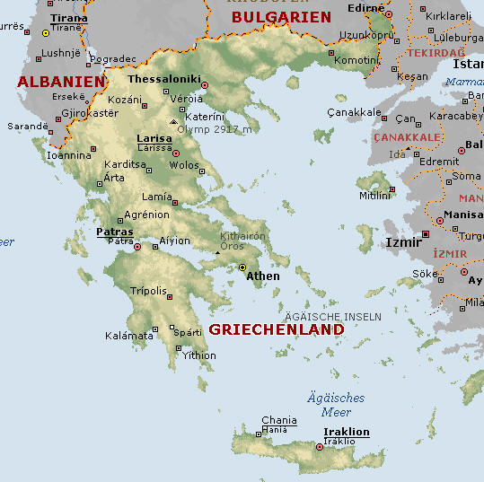 Griechenland, amtliche Vollform: Griechische Republik (neugriechisch Ellinikí Dimokratía); Land in Südosteuropa, das aus dem südlichsten Teil der Balkanhalbinsel und zahlreichen Inseln besteht. Griechenland grenzt im Nordwesten an Albanien, im Norden an die Ehemalige Jugoslawische Republik Makedonien und an Bulgarien, im Nordosten an die Türkei, im Osten an das Ägäische Meer, im Süden an das Mittelmeer und im Westen an das Ionische Meer. Die Gesamtfläche des Landes beträgt 131 957 Quadratkilometer; davon entfällt ein Fünftel auf die Inseln im Ägäischen und Ionischen Meer. Athen ist die Hauptstadt und zugleich die größte Stadt des Landes.