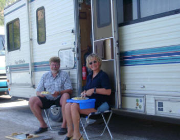 Die Nacht war ruhig, und wir haben prima geschlafen. Unser Vorhaben, draußen vor den beiden Bullaugen am Mü-Schnei-Womo zu frühstücken, setzen wir selbstverständlich am Morgen um.