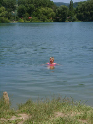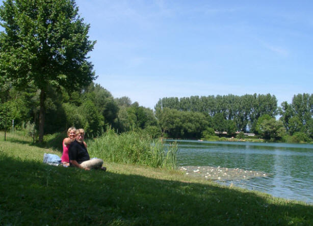 Kurz entschlossen fahren wir von der A5 ab. Bei der zweiten Tankstelle haben wir Glück: Wir finden Manhattan Eis, Geschmacksrichtung Vanille. Na bitte! So, jetzt auf zum See! Auf dem offiziellen Parkplatz beim Strandbad ist die Hölle los, hier finden wir keinen Platz für unseren Kleinen. Also fahren wir (ist das toll mit meinem Routenplaner und dem GPS-Empfänger) einfach ein Stück um den See herum. Bei einer Gokart-Halle können wir schließlich parken.